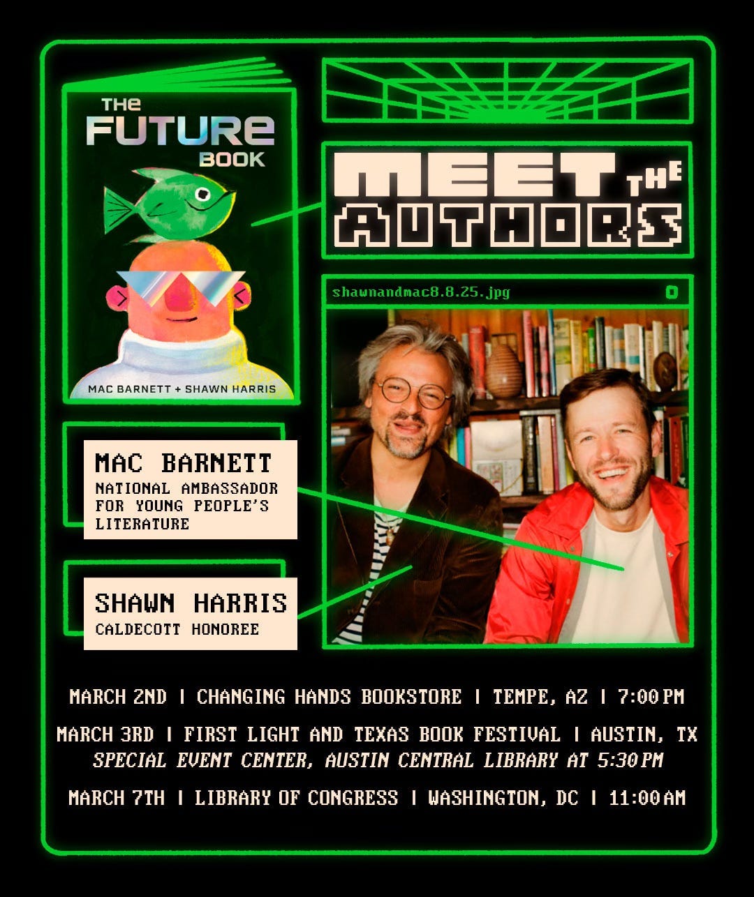 Also—Shawn and I are going on tour. Three dates, and we’ll be reading picture books and singing songs at all of them. They’re all ticketed, I think, so reserve your spot.